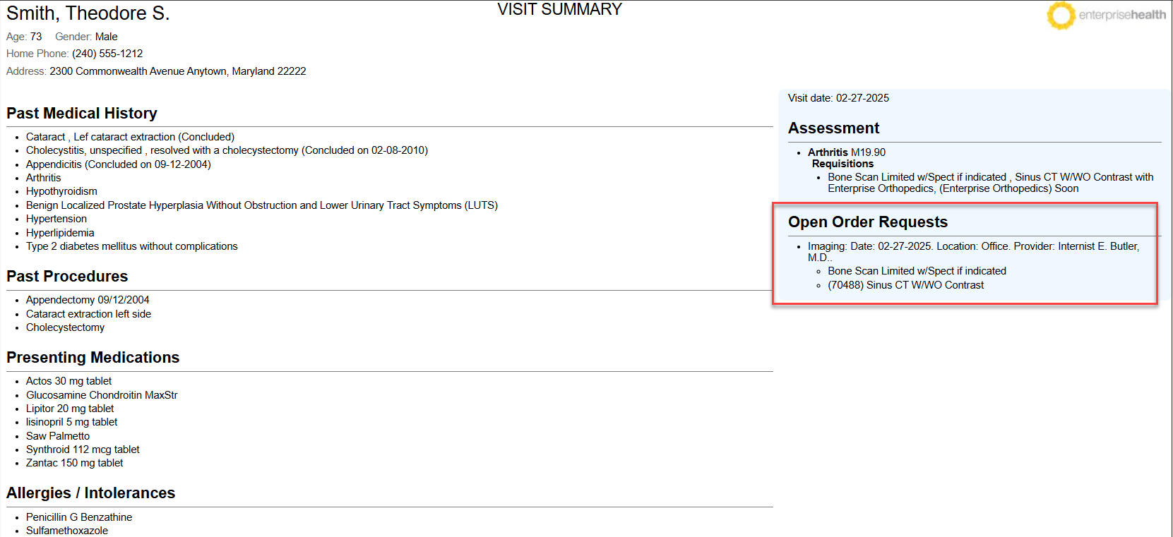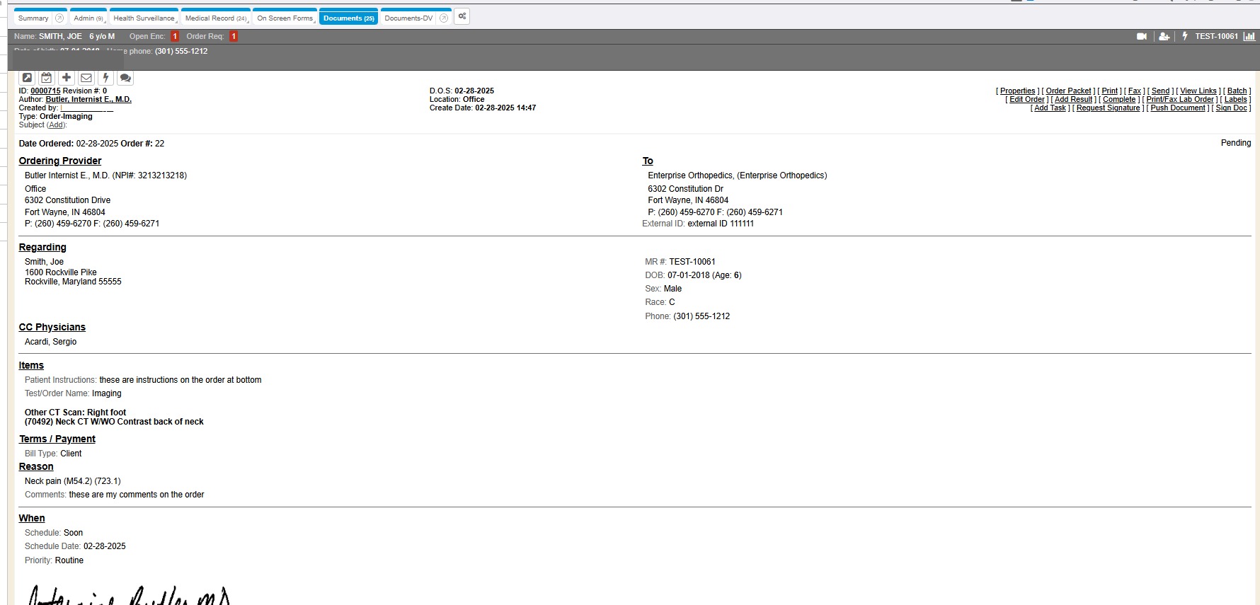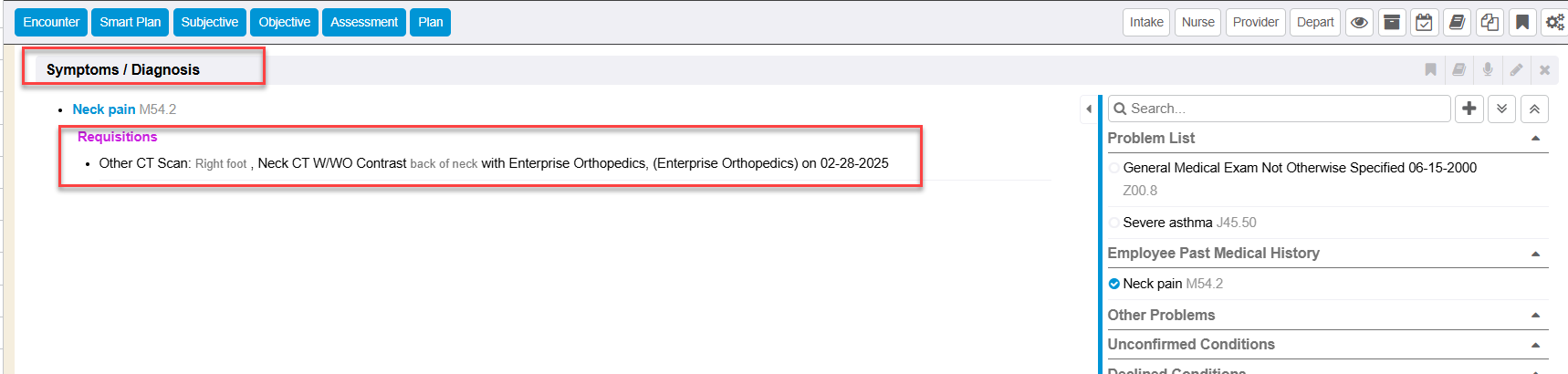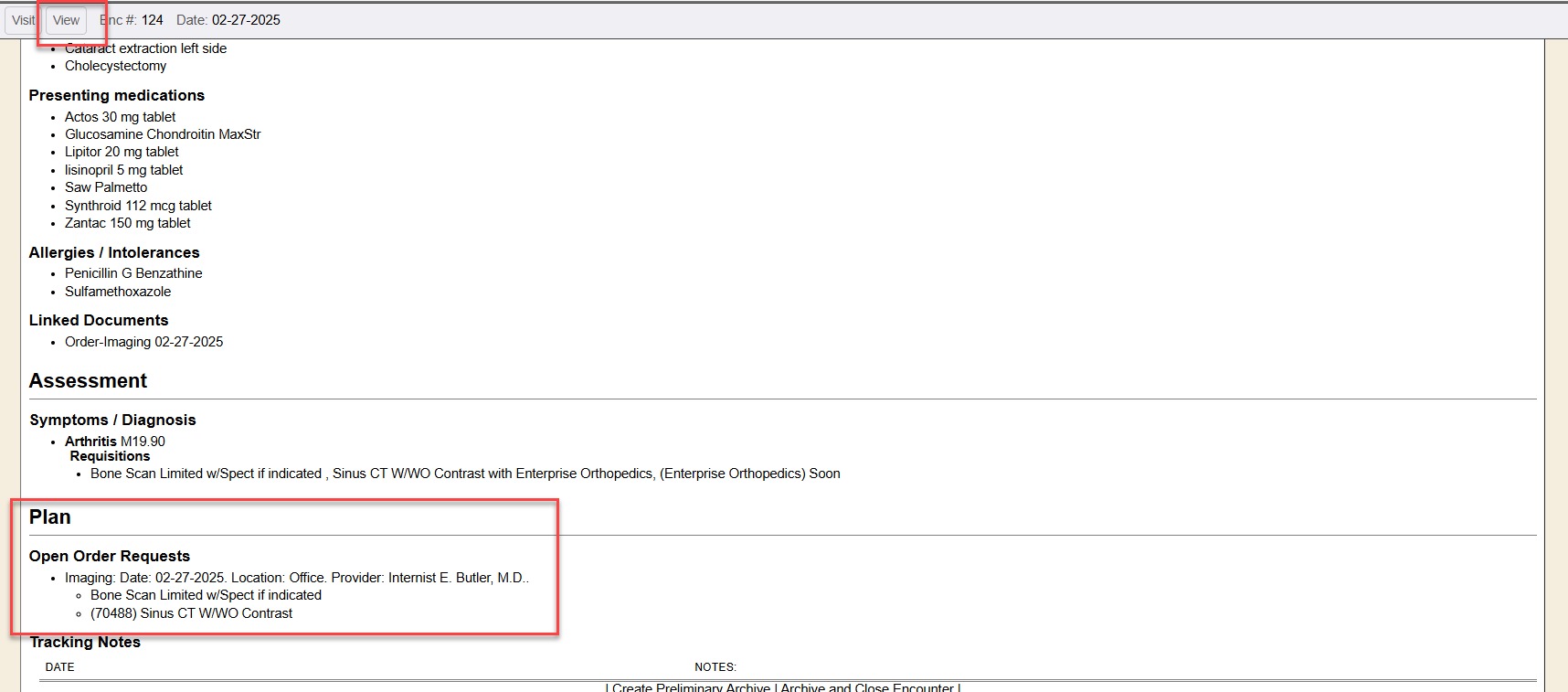 If there were any order requests made by the provider, those open pending order requests show on the encounter “view”. The order requisitions are listed in the plan area of the encounter document.