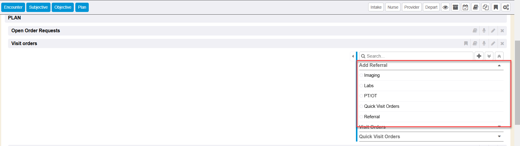 NOTE: The preconfigured Order Picklist categories that display as an ‘Add Referral’ right side option selection are managed within the Encounter Types editor (within the control panel) for the specific encounter type configured for your system. Therefore, various Order Picklists could show or be hidden based on what encounter type you are working in. For more information on how Encounter Types are configured, please refer to the Encounter Types guide.