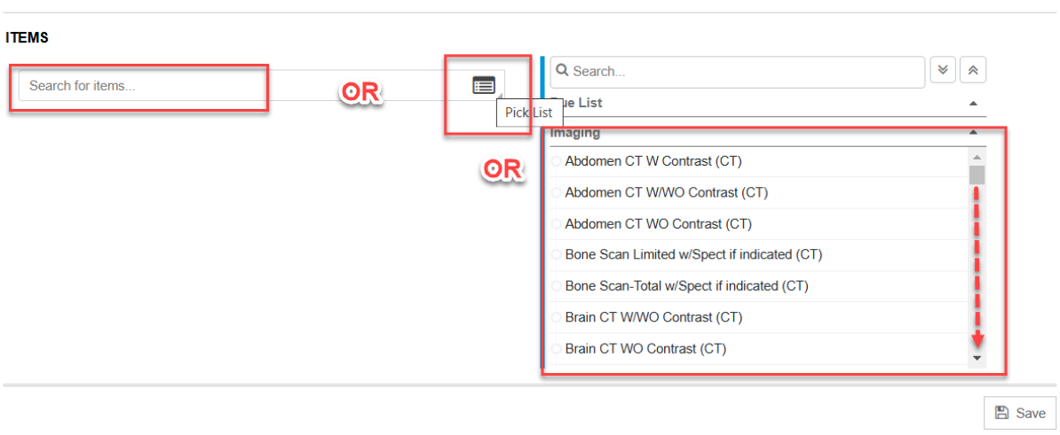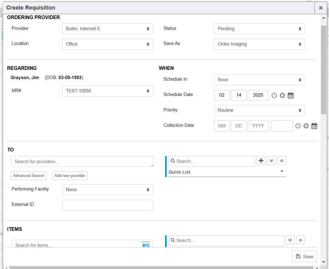 - Search for items: This section is where you specify and select the specific tests, procedures, items, etc of what the order requisition should contain to have collected, performed, resulted, etc.
