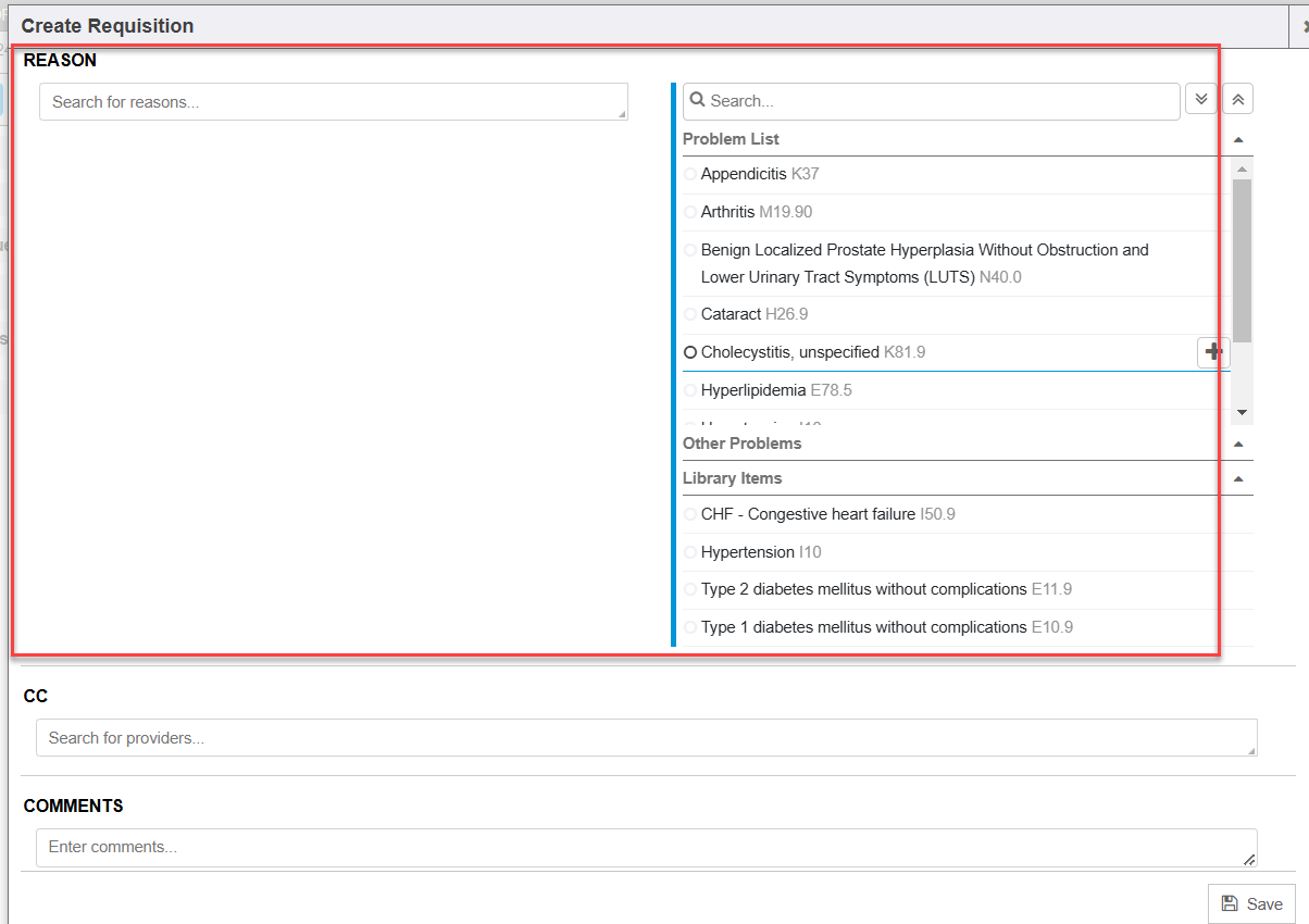 Once you select a referral category (ex: Imaging), a pop-up window to Create Requisition will display where you can select specific items to order in one requisition and fill out order details. Upon save, this will create an order requisition document that can be shared (printed, faxed, etc) and tracked to completion of results being received back.