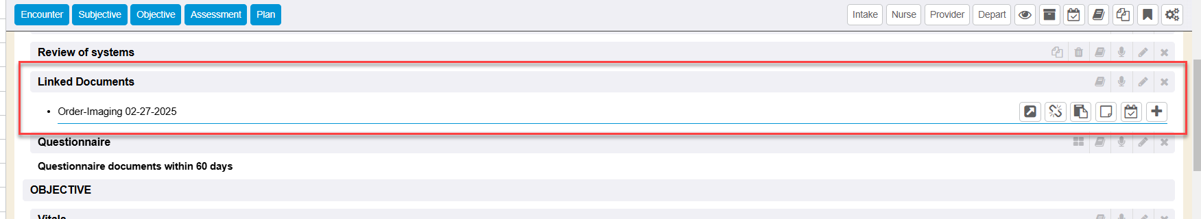 Any order requisitions that were saved/generated during the encounter save as its own Order document in the chart and is linked to the encounter. The linked Order document will also be found within the encounter Smart Plan section. There are option icons available from that order requisition document area also.