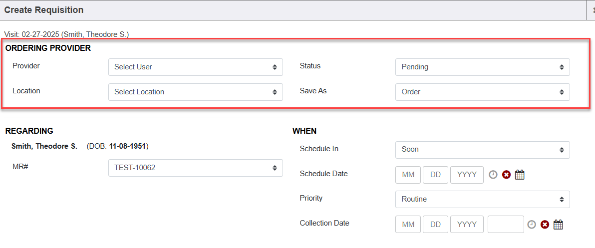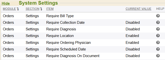 Out of the box, we require an ordering provider and location to be signified on an Order Requisition before being able to save/generate the order. Your system may be set up with additional required fields on the Order Requisition screen, depending on the system settings enabled for the Orders module. There are several system settings offered for the Orders module, but these are the system settings in regards to which fields can be set to required or not.