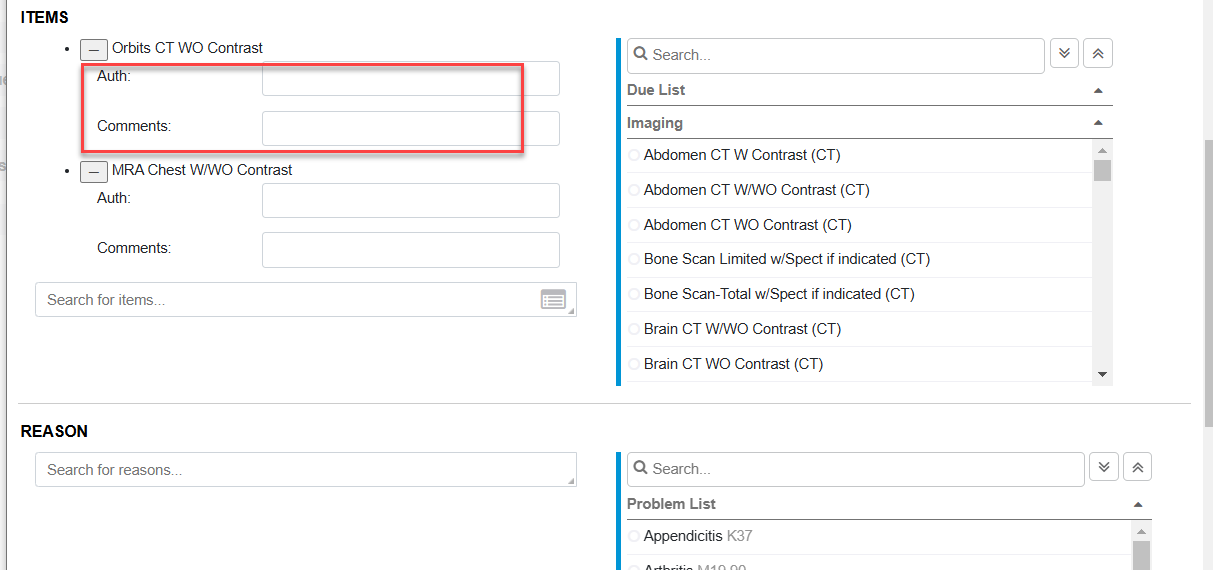 - Comments: this is an optional free-text field to key in any comments for any individual item. Item comments typically include the ‘side’ of the body to xray, etc if the order item isn’t specific enough. These are shown on the stored order document and the Order Requests tracking datavis tab.