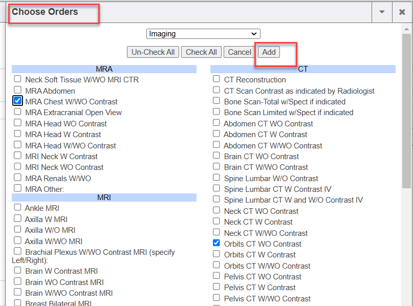 - Picklist icon: The picklist icon (next to the autocomplete field) can be clicked to pop-open the Choose orders screen that lists all order items configured within the selected picklist. You can also change picklist selections in this pop-up too. Select the items you wish to order by checkmarking them and then clicking the ADD button.