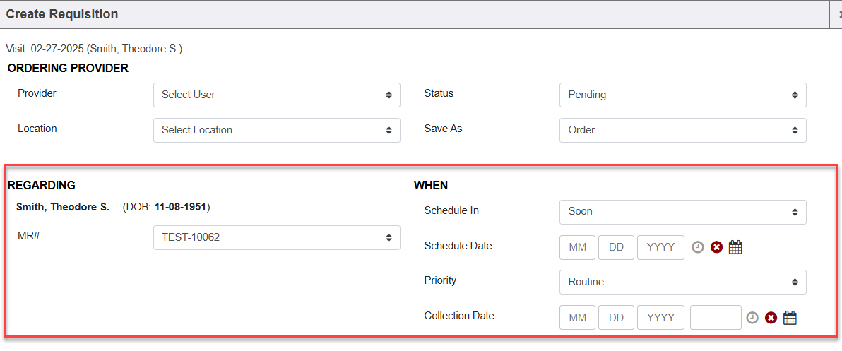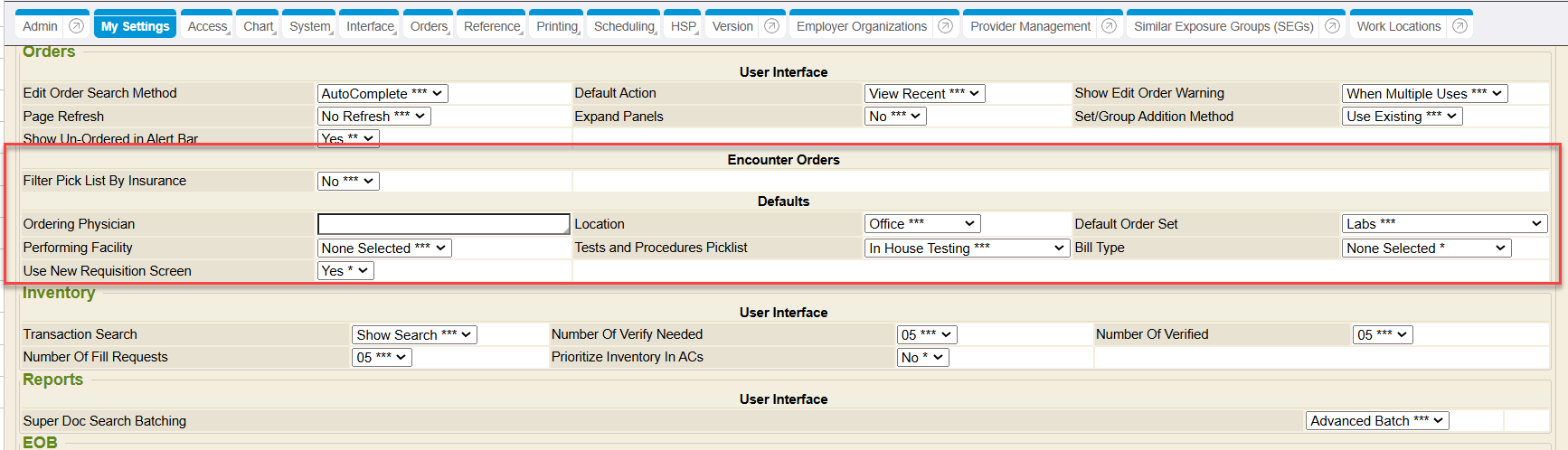 Depending on what you have set as preferences for Encounter Orders (in My Settings), the Order Requisition screen may prepopulate fields such as Ordering Provider, Location, Performing Facility, and Bill Type. Even though fields may prepopulate from these preferences, you can still change or override them in the Order Requisitions screen before saving/generating the order request.