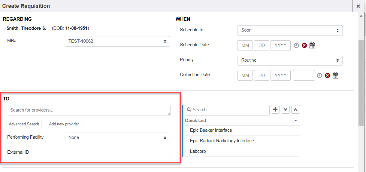 - To (search for providers): This is the field to document whom you are referring this patient’s order to be done/resulted/processed by/referred to. This To field is a user autocomplete that pulls from the referrable entity provider organizations or provider charts. One can also utilize the right hand side Quick List to select a To Provider quickly to insert into this field.
