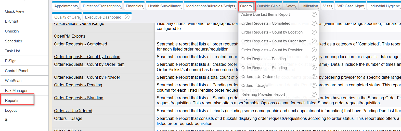 - Orders - Usage: Searchable report that consists of 3 buckets displaying order requests/requisitions according to order status. This report also offers a performable Options column for each listed order request/requisition.