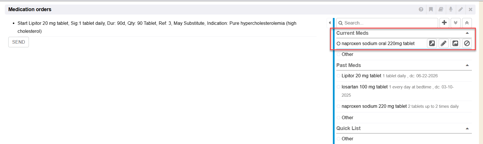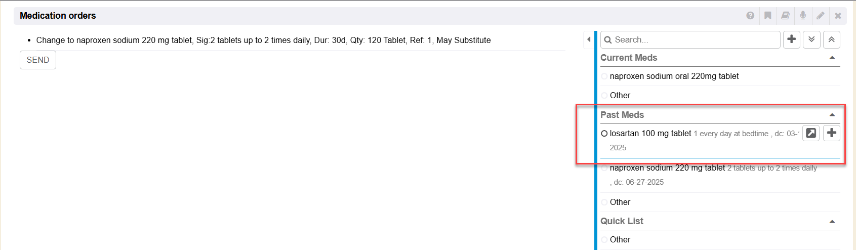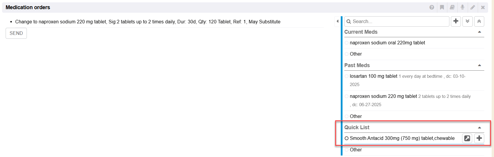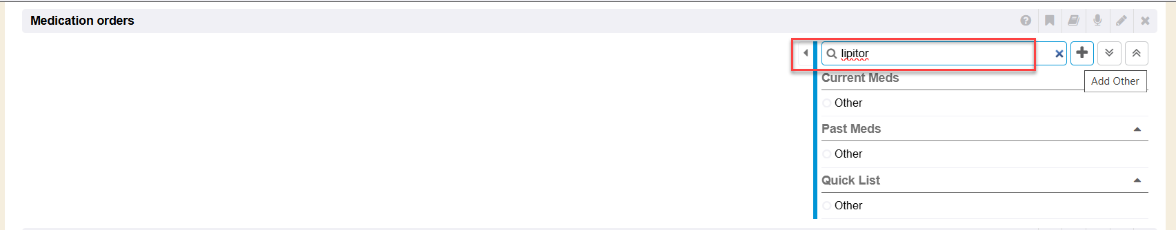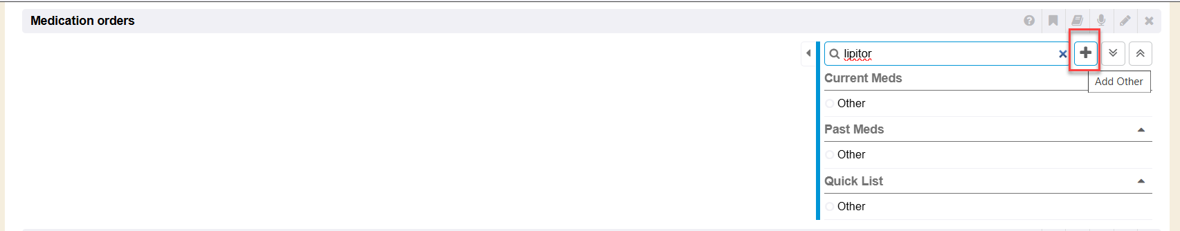 Any medication selected from the Medication Orders right side quick list method can quickly be clicked to Prescribe (+ icon).