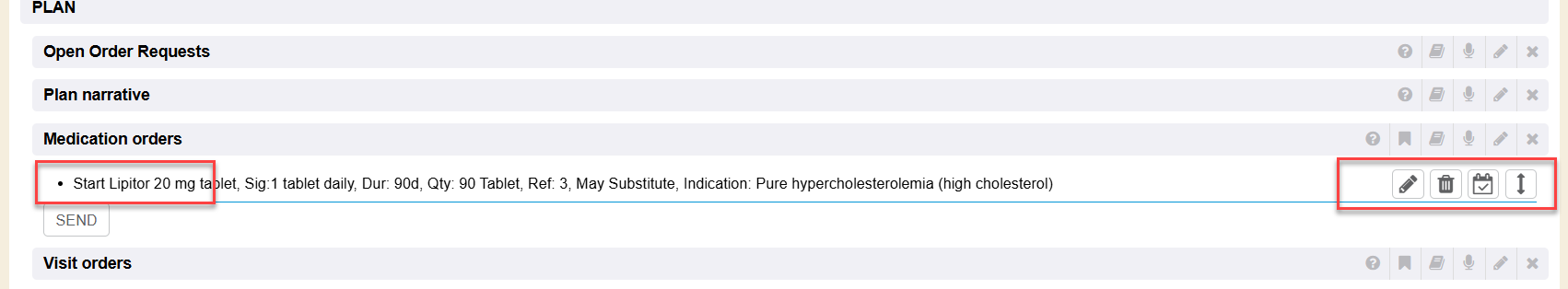 Then within the Medication Orders section (after creating a prescription), you can do further things to it using the function icons on each row. Such as add a task regarding it, edit it, rearrange the prescriptions order for the encounter documentation, edit it, and electronically send/transmit the prescription to a pharmacy.