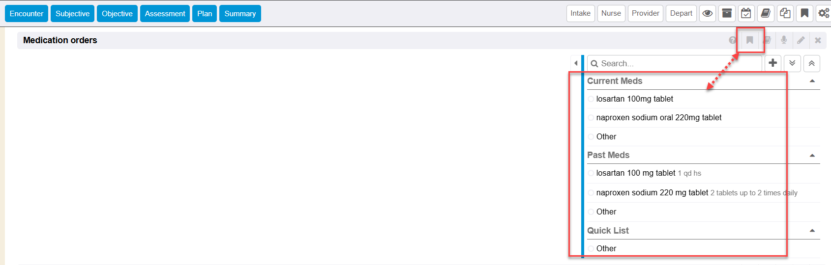 A banner or bookmark icon is located on the right side of the Medication Orders encounter section. This can be clicked to expand open to utilize the right side quick list functionality for the Medication Orders section.