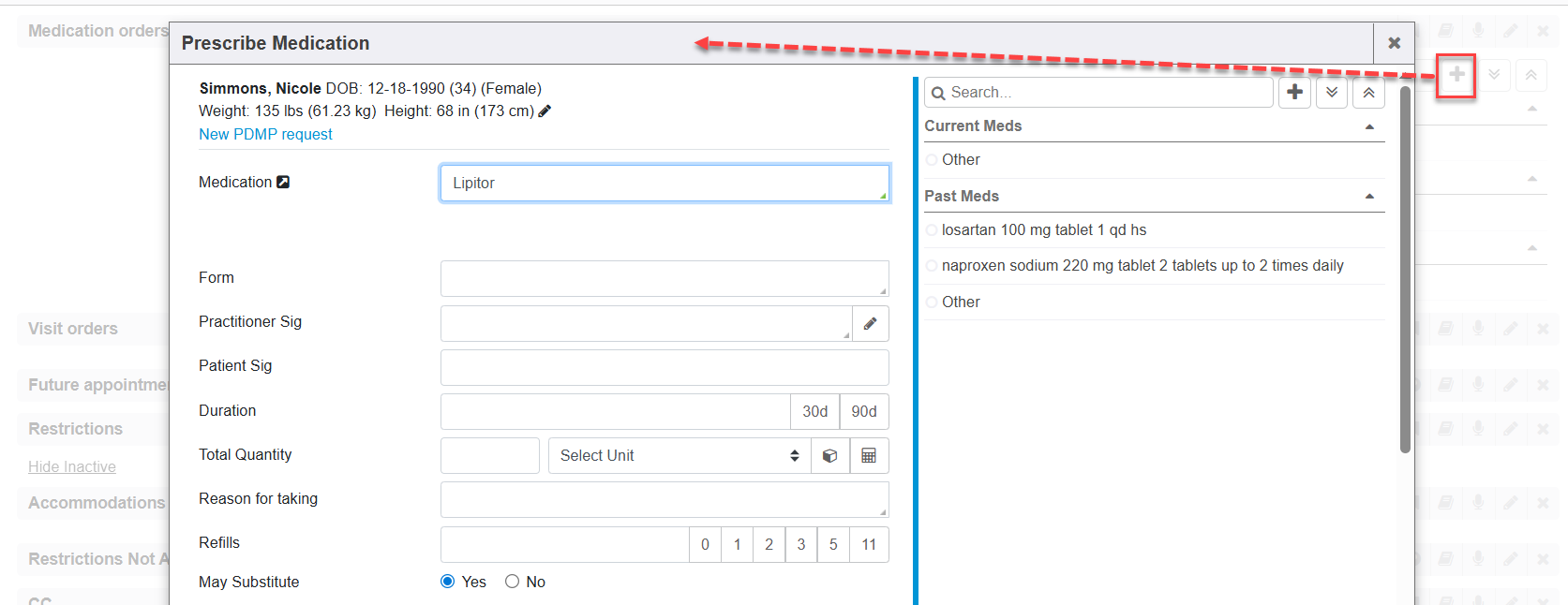 A medication that you need to order can be added to the encounter, which is entered as a prescription. You can simply search for a medication name using the search field or click the + icon to search for a specific order item.