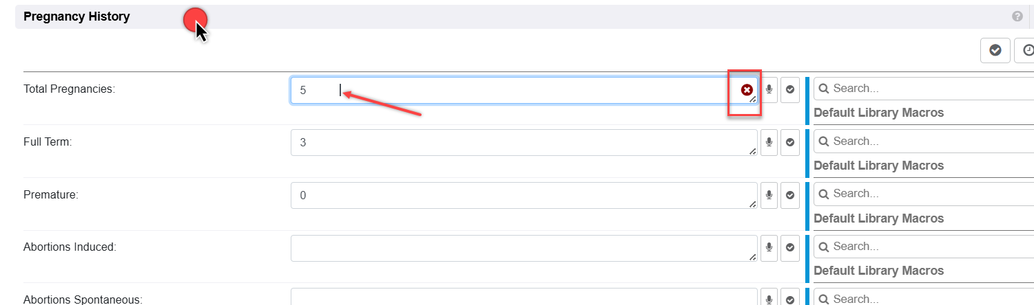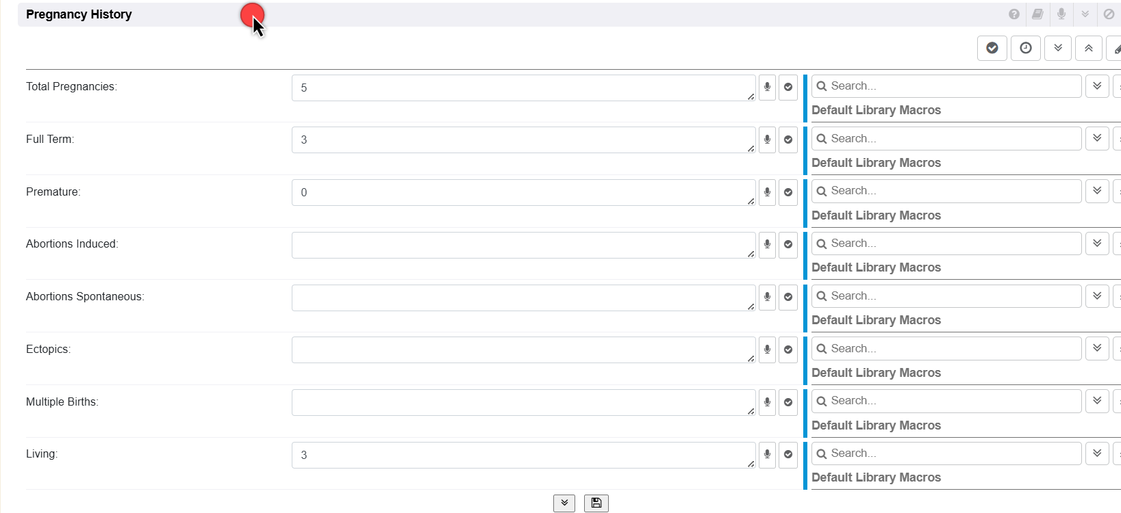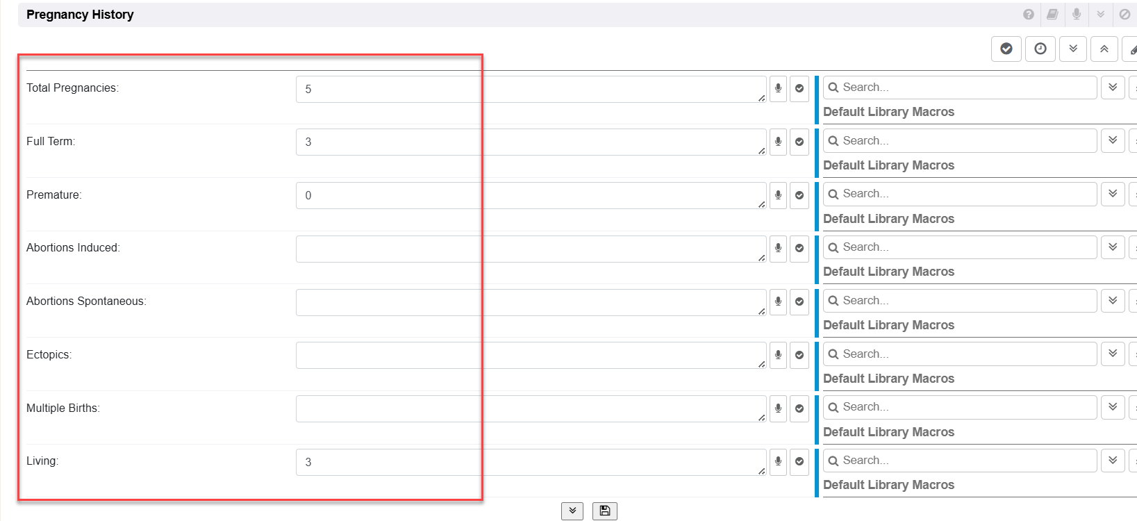 Use the free text fields, speech to text dictation icon, or use the previous value quick text or library macros on the far right to quickly get the Pregnancy History documented.
