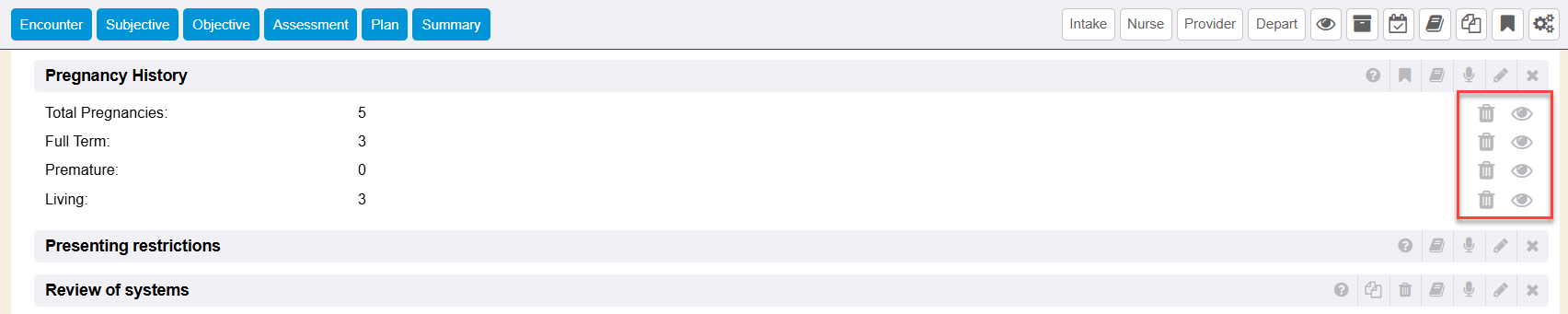 Also while the encounter section is in summary collapsed view, icon options next to the stored data will display.