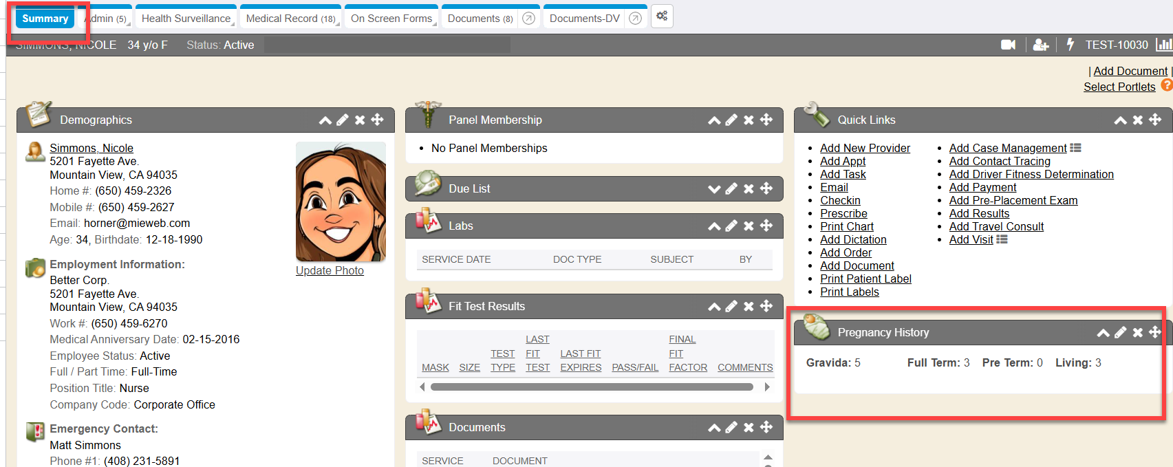 Pregnancy History data stores as observations within the chart. Most recent recorded pregnancy history is also visible within a portlet on the Summary chart tab dashboard.