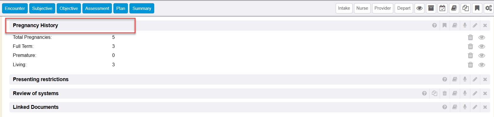 To record or edit Pregnancy History information within the encounter, simply click anywhere on the Pregnancy History grey title section area to expand open that section.
