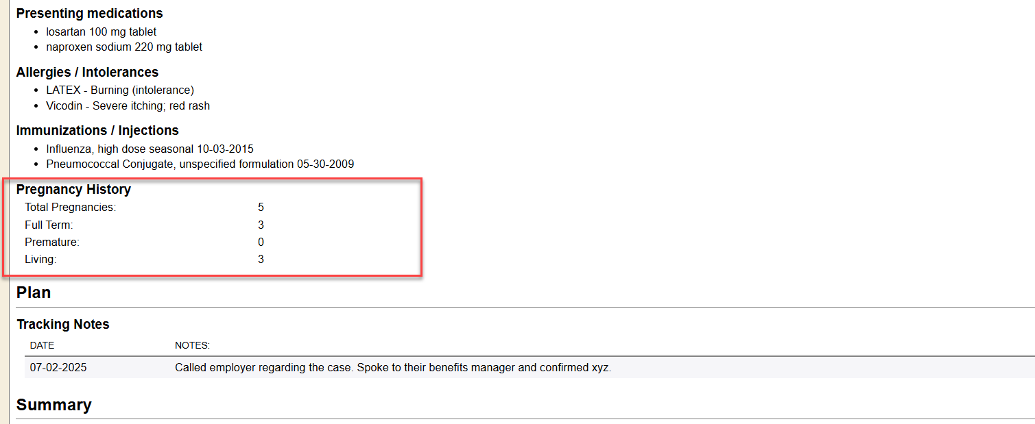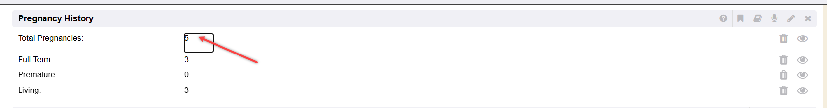 From the section’s collapsed summary view, simply click on the values/data of the specific Pregnancy History line item to edit on or add to. The data will be displayed in a border box where you can begin modifying or typing in more information.