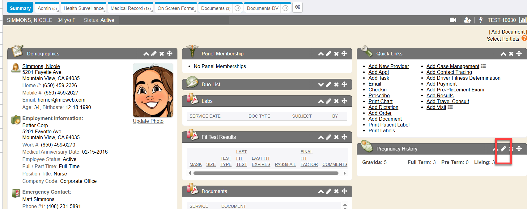 Pregnancy History can be updated from the portlet by using the pencil icon.