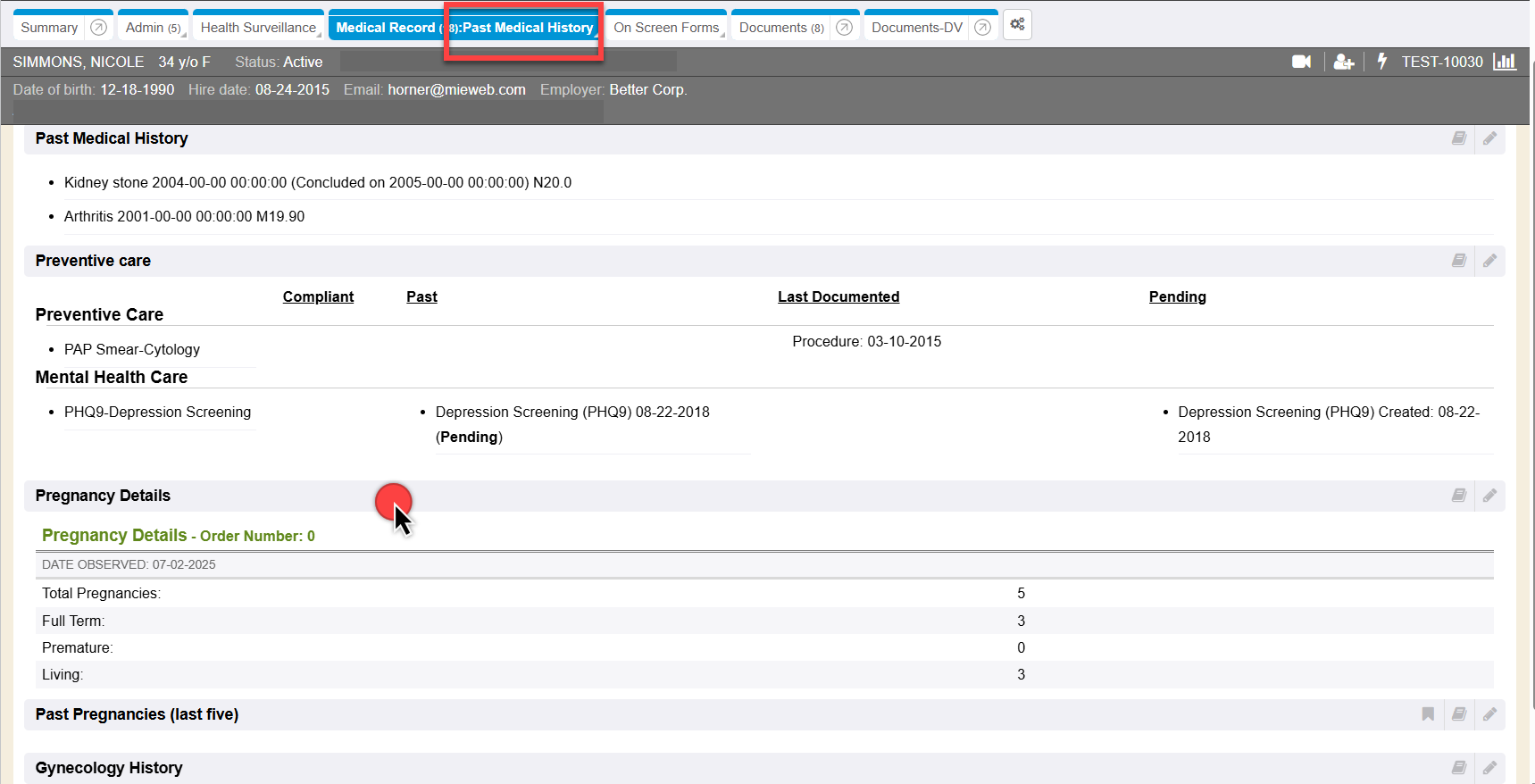 That then opens the separate chart tab Past Medical History where the Pregnancy History section is offered. Clicking the grey title bar area (like within an encounter section behavior) is where the pregnancy history fields will open for recording data or updating data.