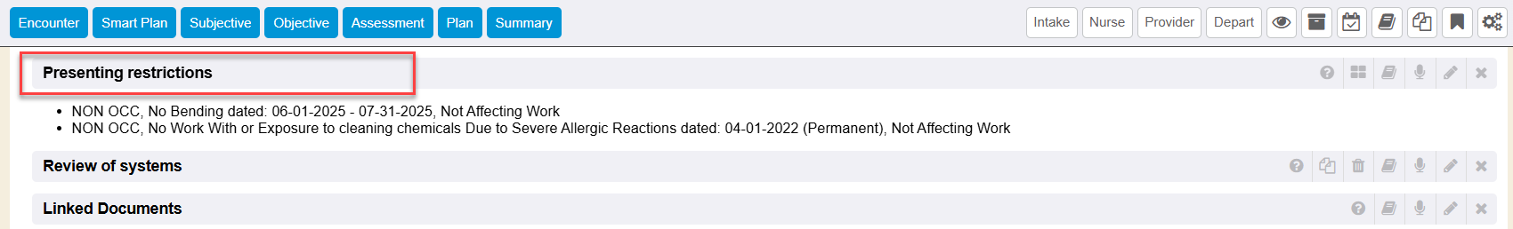 The presenting restrictions displayed in this section are active, current restrictions that are valid as of today’s logged in date. This section is for visibility purposes to quickly see any active restrictions a chart has when working in an encounter exam.