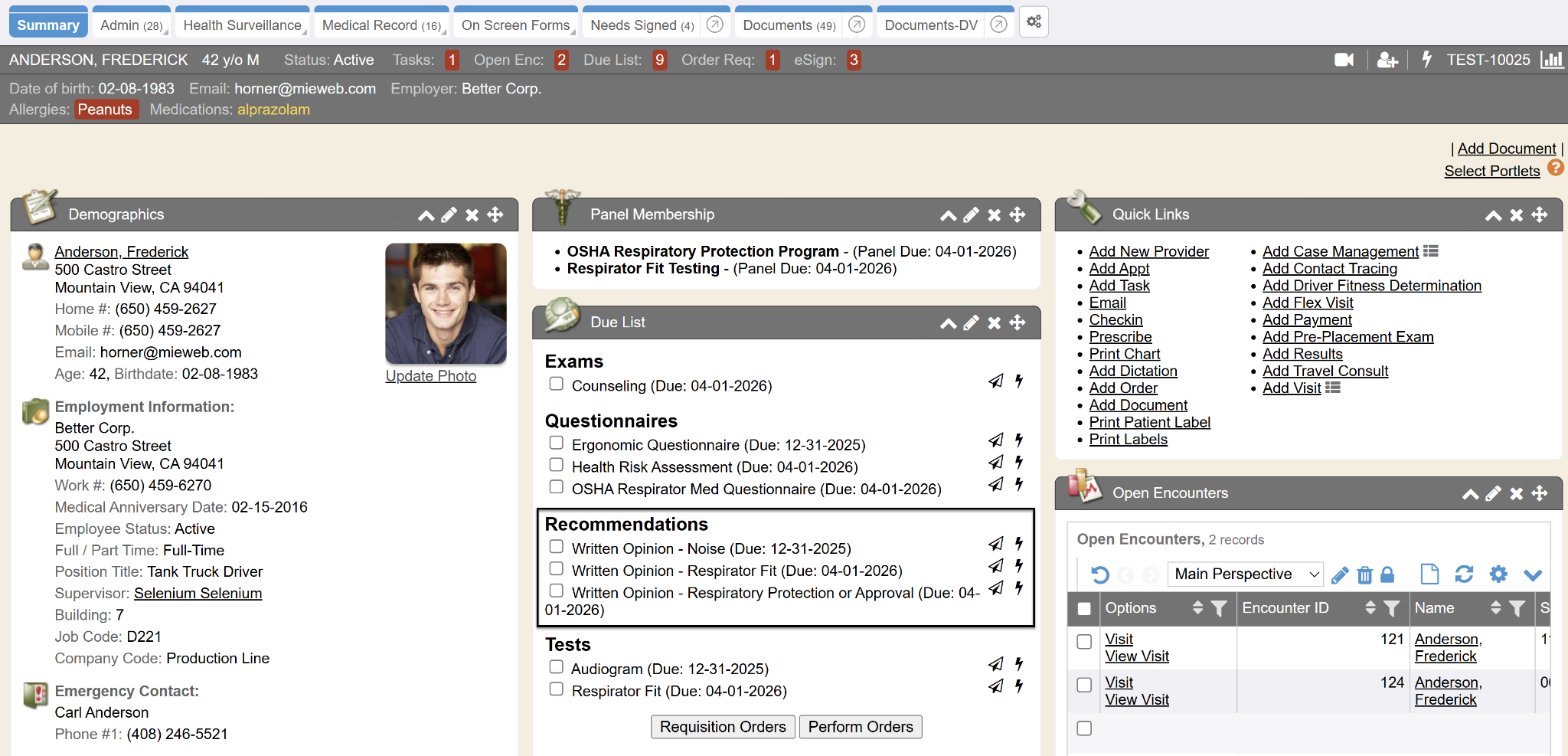 Recommendations are written opinion panel action items that are programmed as unique representative events within a health surveillance panel. Recommendations are the final determination of the overall panel status for the patient/employee. When a health surveillance panel ‘evaluates’ to trigger all tests/procedures that need completed for a specific panel, the pending written opinion/recommendation will display as such in the Due List portlet, Due List chart tab, and in the Recommendations section of an encounter.