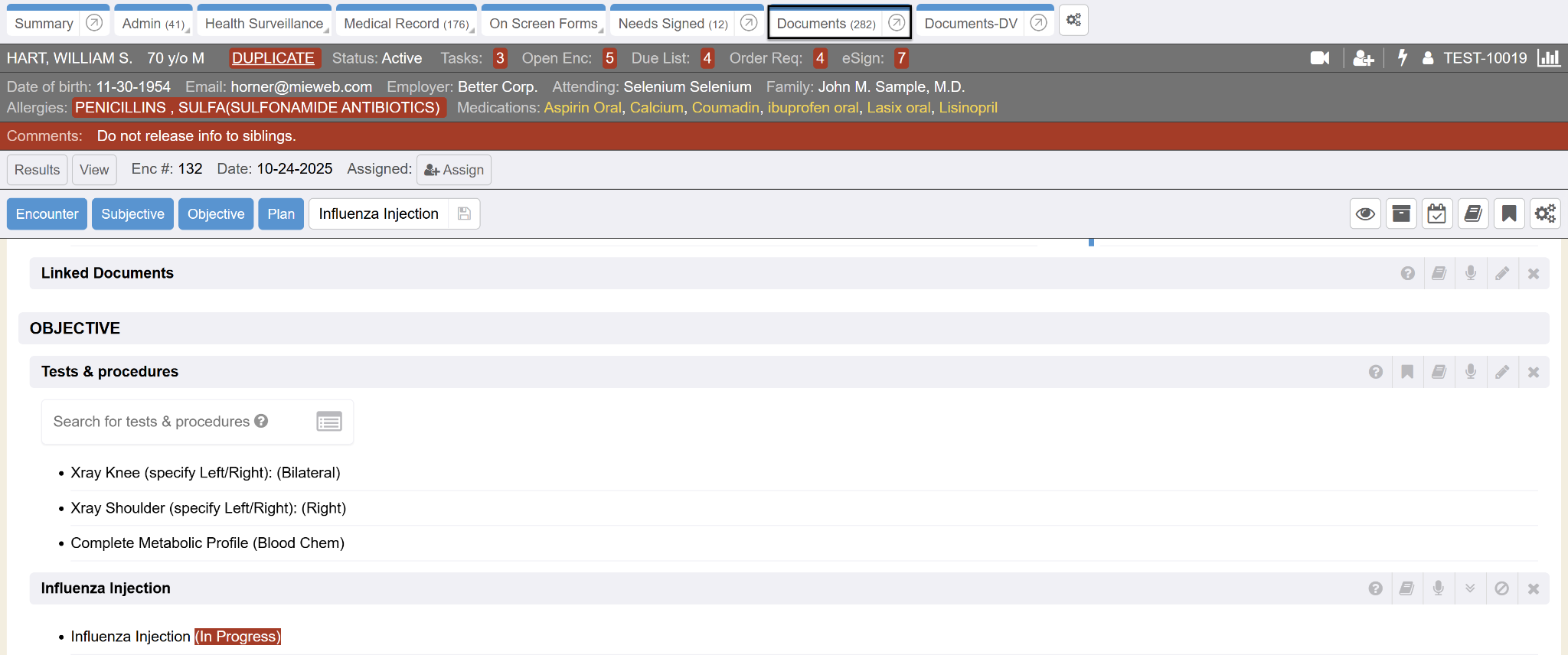 The Tests & Procedures encounter section can be found in the Objective section. This section mimics the stand alone “Due List” chart tab. The Tests & Procedures section displays items that are “due” so when a patient comes in, and the staff is working in an encounter, the clinician has visibility of items that the patient is due for, here in this encounter section.