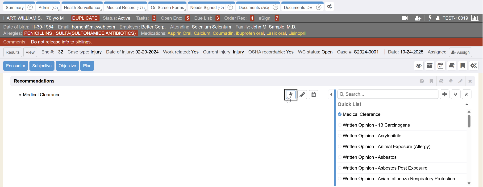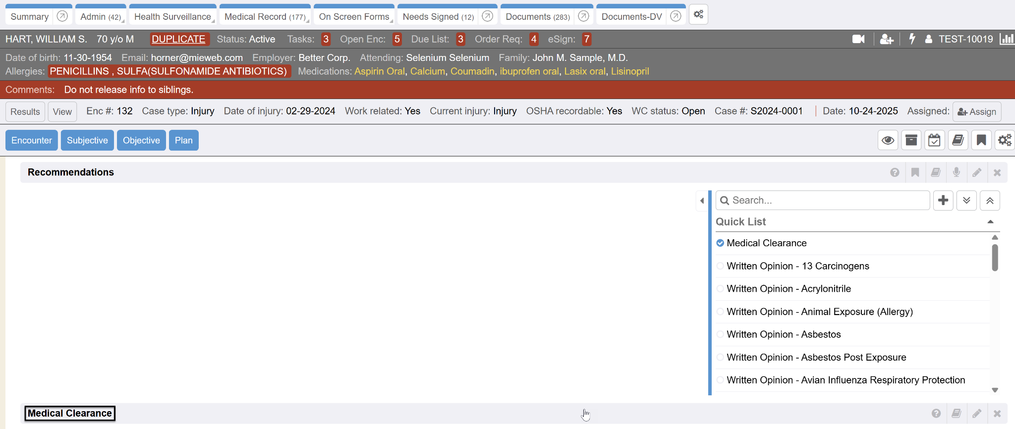 The Recommendation section displays only RE order types (recommendation/written opinion) action item associated with the employee’s panel (its representative event). Note: RE order types (recommendations) are not able to be added or applied in the encounter tests/procedures encounter section. Only RE order types (recommendations) can be added or applied in the Recommendations section of an encounter.