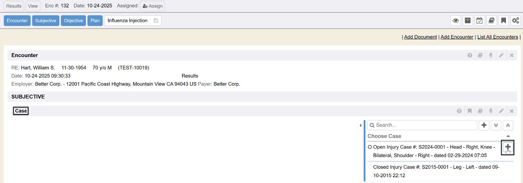 A user can link the Results encounter to a previously opened case by clicking the plus icon on the Quick List or create a new case by opening the Case section by clicking the gray Case bar.
