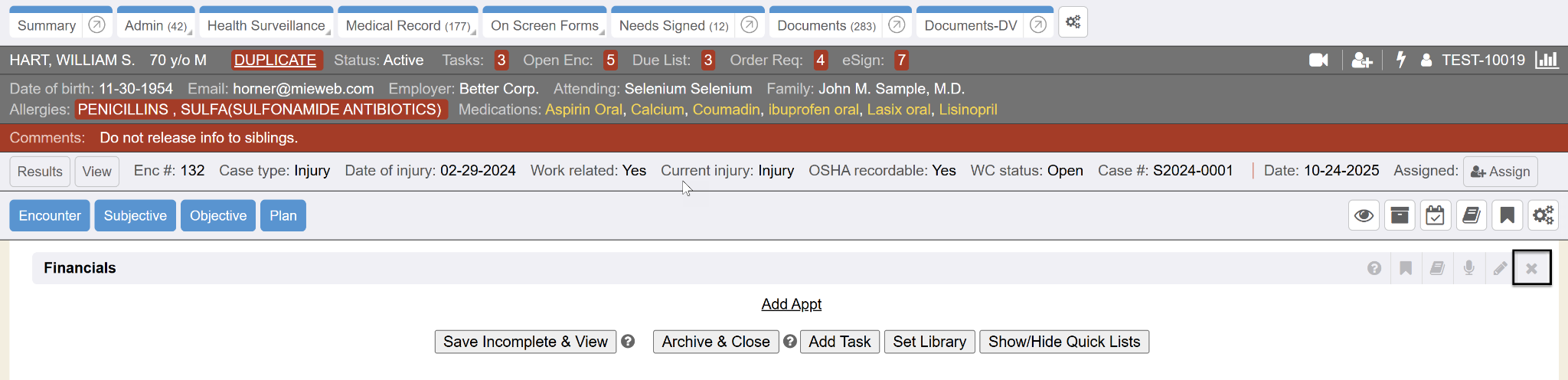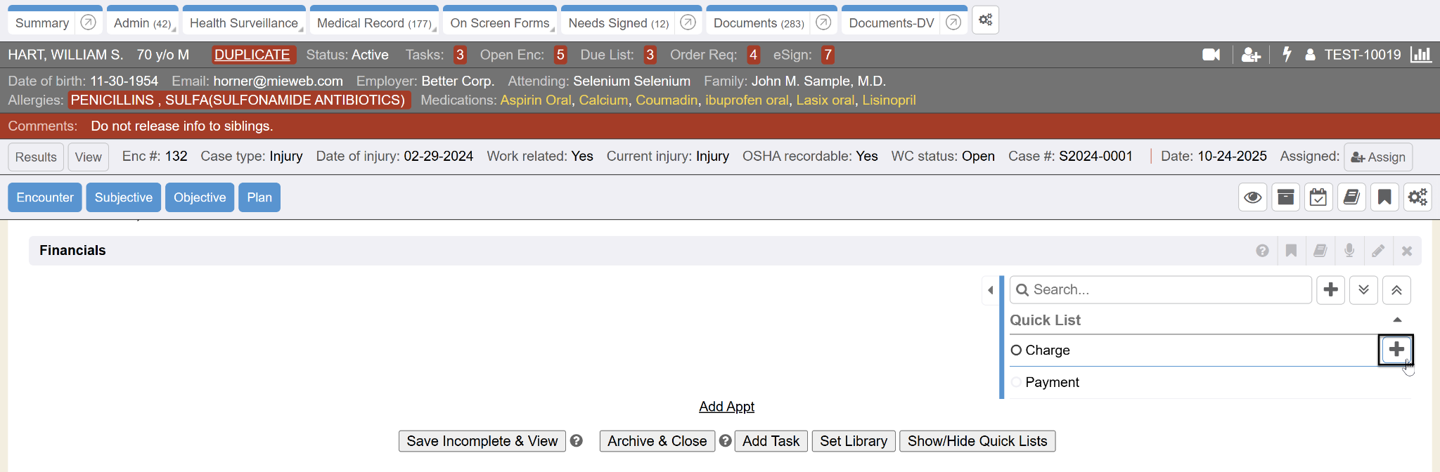The Financial encounter section lists and allows charge and payment capture. Most charges are added automatically, but you can add or remove charges and payments as necessary using the right side quick list method.
