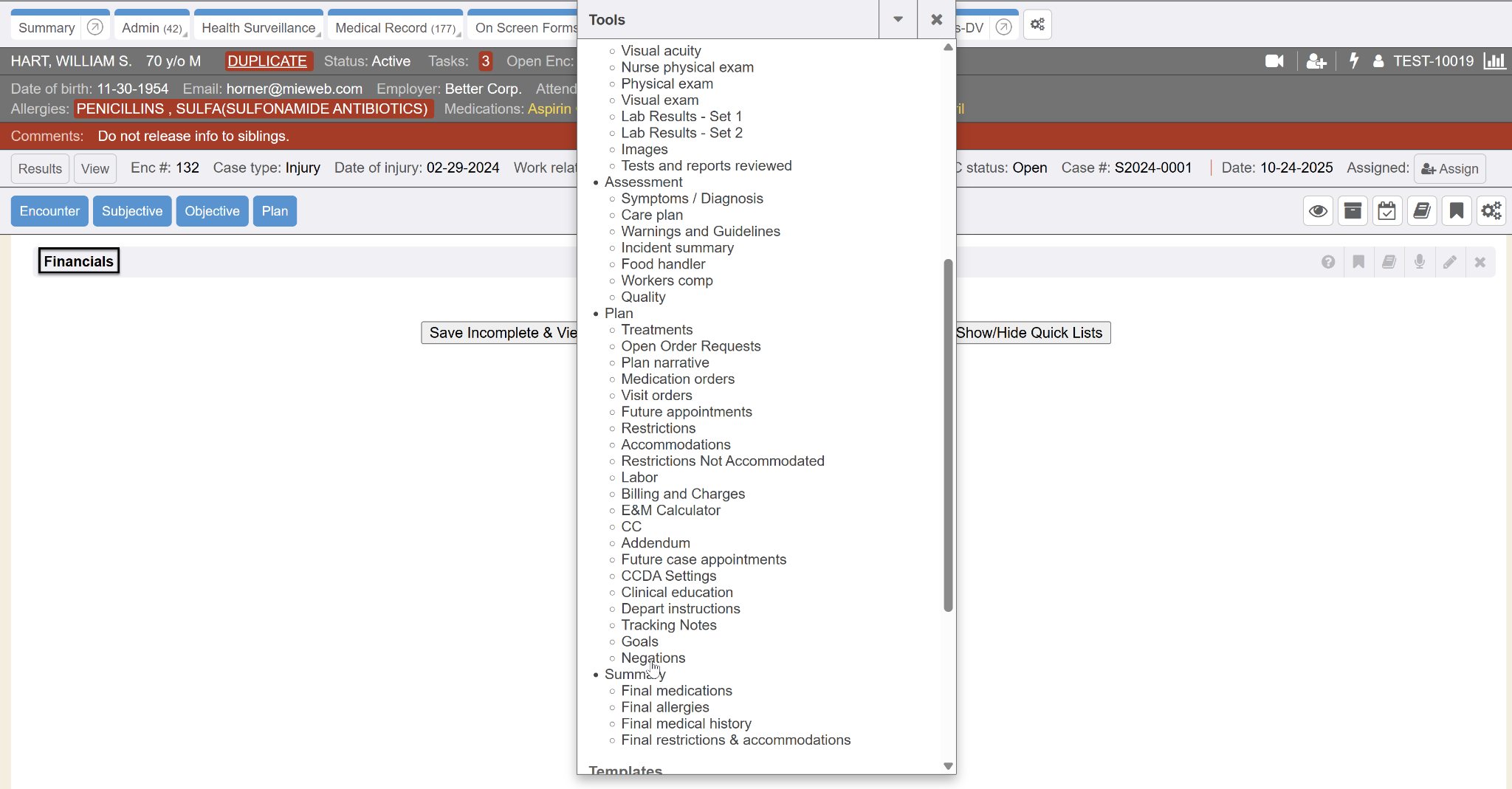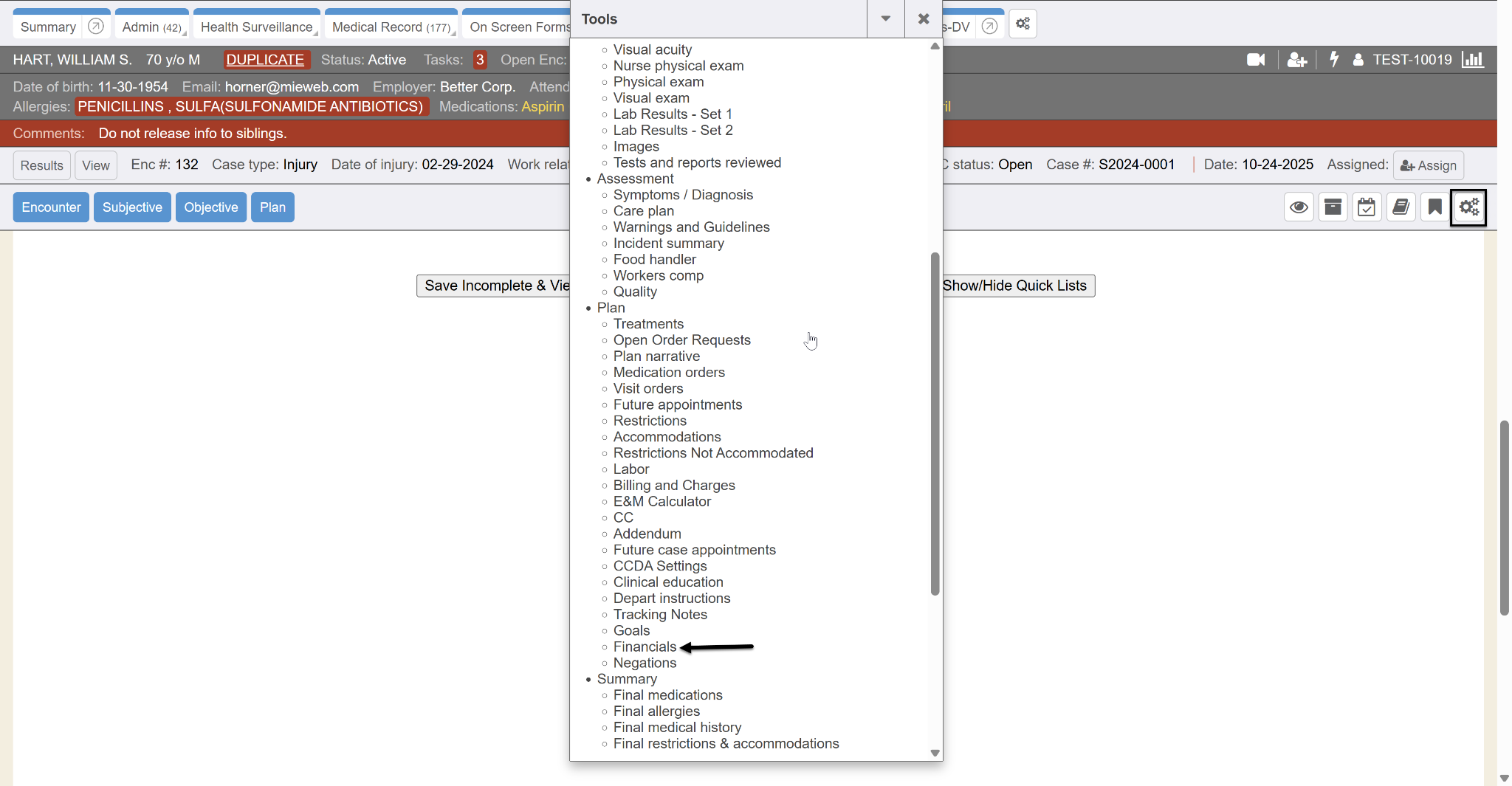 Once I clicked on the word “Financials” from that pop-up window, the Financials section immediately inserted back into the proper position in my encounter. It also immediately removed that in the list of my Tools hidden items section since it’s now not hidden anymore and is back populating in the encounter.