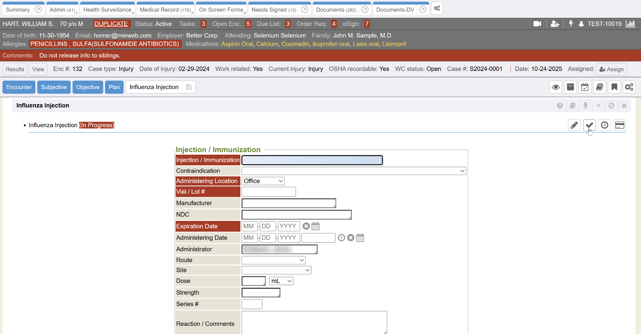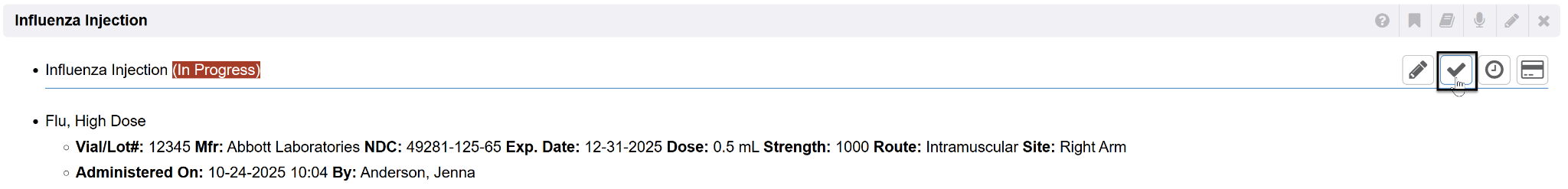 The individual test/procedure item will expand to open the section data fields to allow you to complete and type in results. Once all fields have been completed, hover over the order and click the Check Mark icon to Complete.