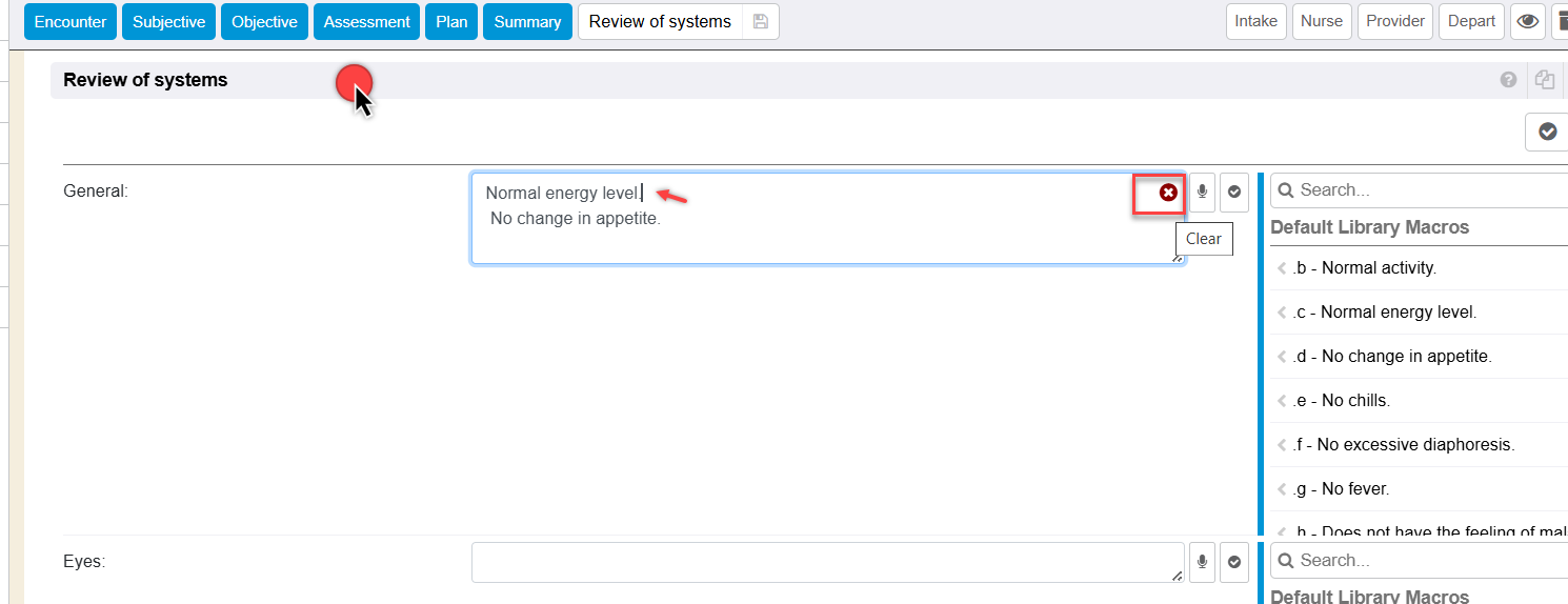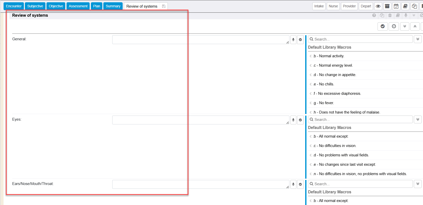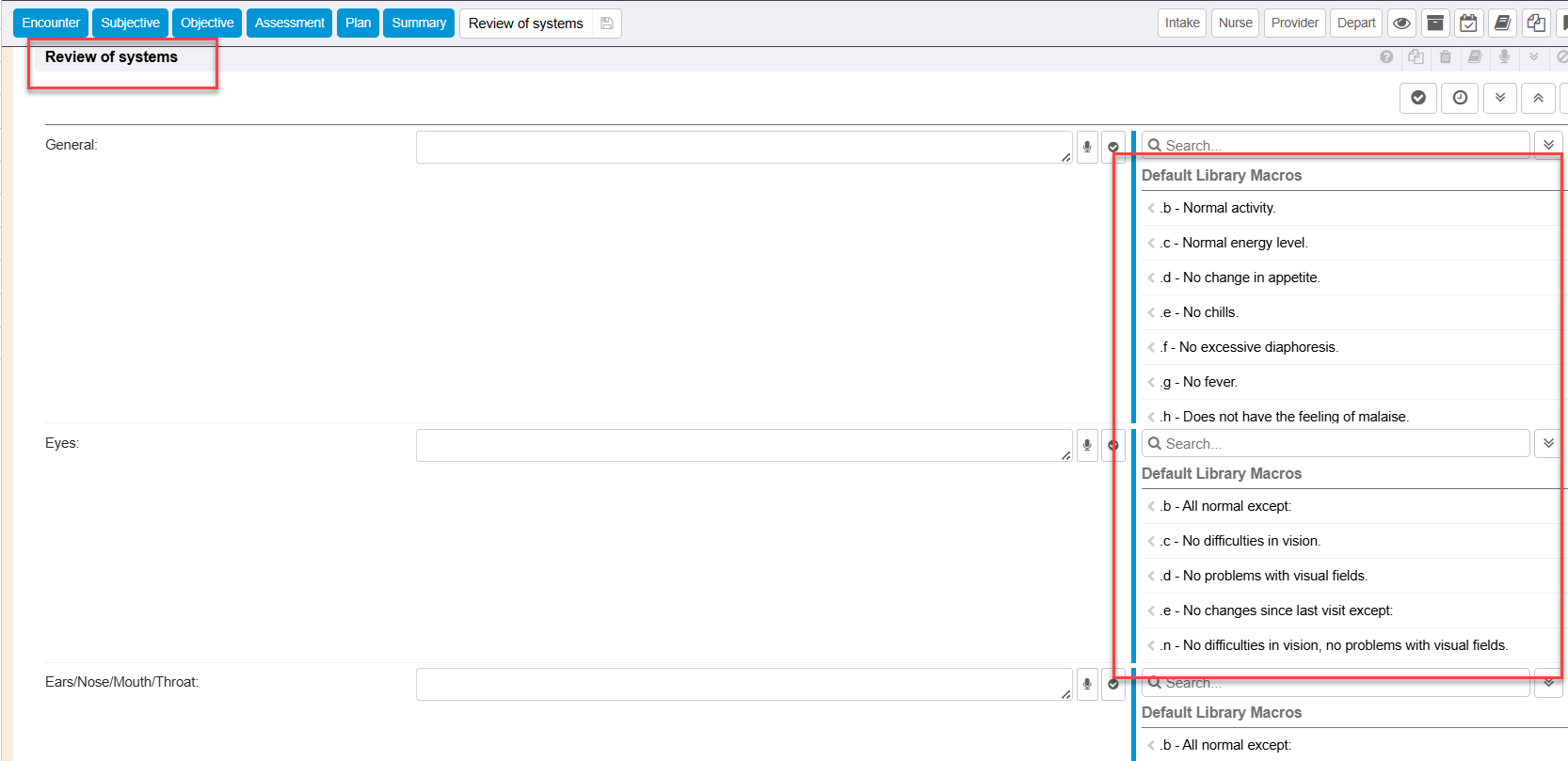 For additional information on configuring and utilizing macros that can be utilized within the Review of Systems encounter section, please see separate guide Macros and/or Libraries.