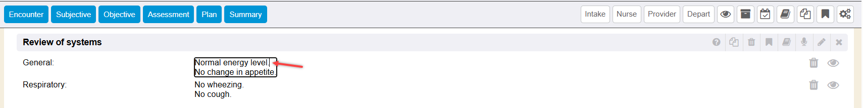 From the section’s collapsed summary view, simply click on the values/data of the specific Review of Systems line item to edit on or add to. The data will be displayed in a border box where you can begin modifying or typing in more information.