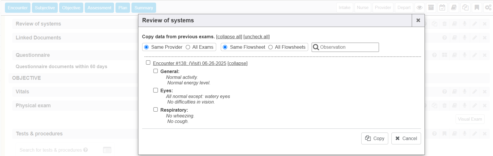 The Copy from Previous Exam icon pops up a window to allow you to select Review of Systems field data that you wish to copy from the chart’s prior encounter(s) to this current encounter.