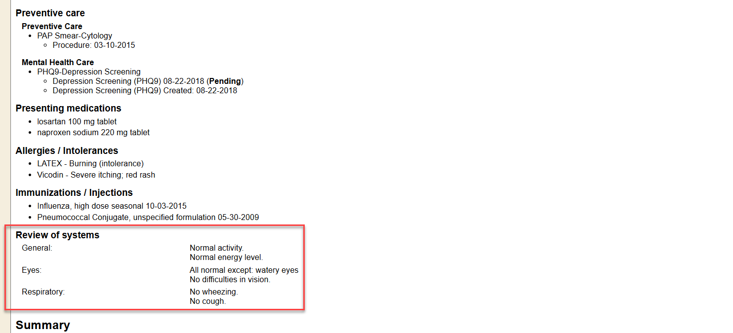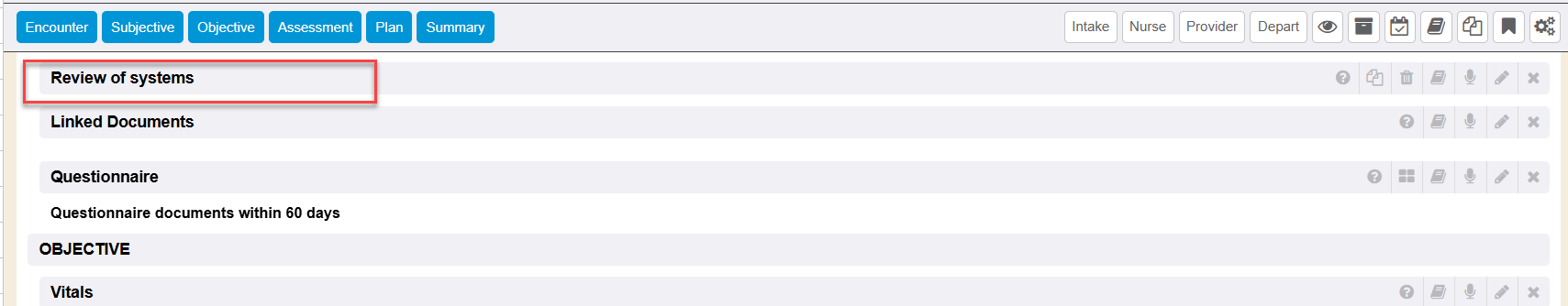 The Review of Systems encounter section is an optional section that can be applied to the encounter outline. This can be used to help document a Review of Systems regarding the visit within an encounter.