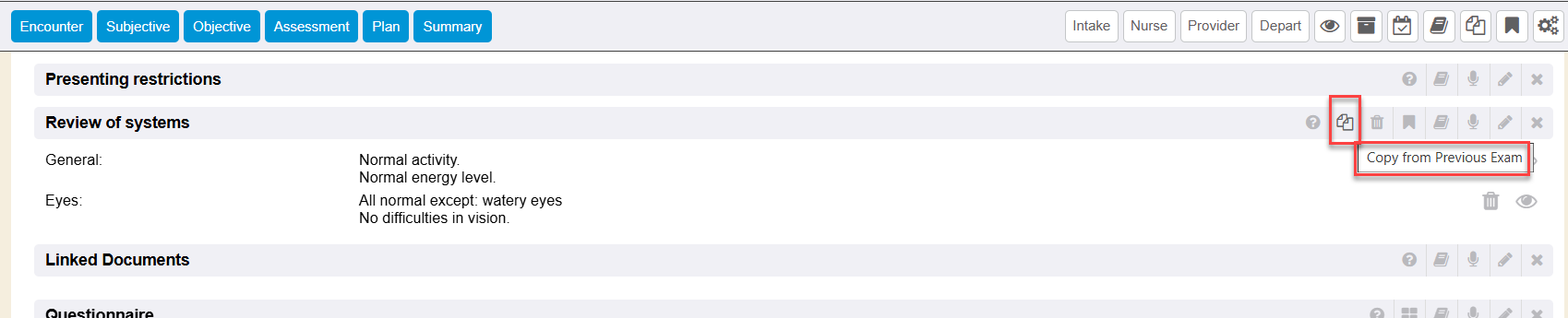 Within the Review of Systems encounter section, there is an icon that offers Copy from Previous Exam functionality.