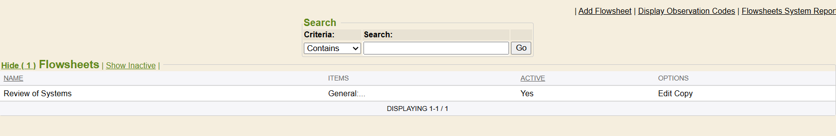 To utilize a flowsheet method in Review of Systems, a flowsheet named Review of Systems must exist with contents.