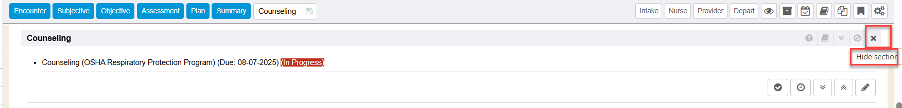 The X may be needed because perhaps you had marked an item as Add to Exam to be done at today’s visit, that indicates the item is in-progress to be performed, resulted & completed), but perhaps changed your mind, or the machine broke down and you realize it cannot perform it today. Using the X (hide section) on the applied in-progress item in the encounter, will remove it from the encounter visit to be performed & completed, and also places the item back up in the Tests & Procedures summary back as pending status.