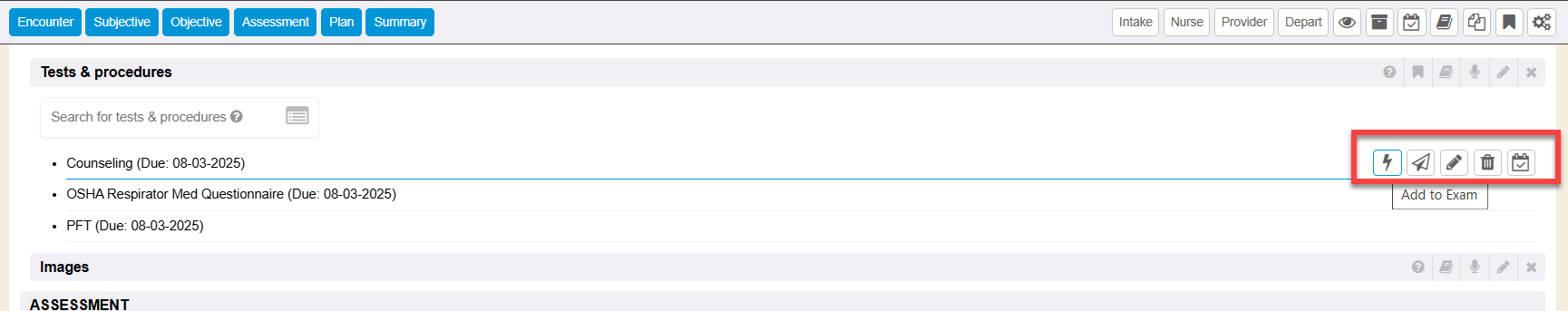 What this does (if X on the in-progress added to exam item section is clicked): It removes the applied In Progress item section from the encounter and will refresh the encounter outline. It then places that item back onto the due list (tests & procedures section) back as pending.