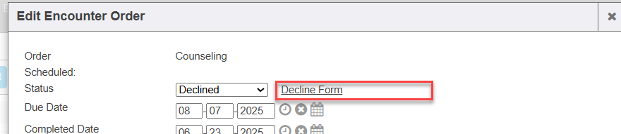 The Decline Form hyperlink will display if a pending due list item is changed to Declined status. For more detailed information on its purpose and functionality, please see Due List guide.