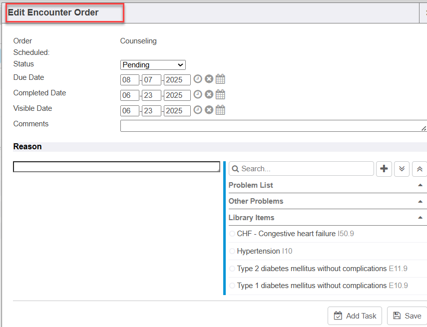A pop-up window to Edit Encounter Order will display. Here, you can edit the order item’s status, or edit its due date or edit its status and add a completed date, or simply add comments.