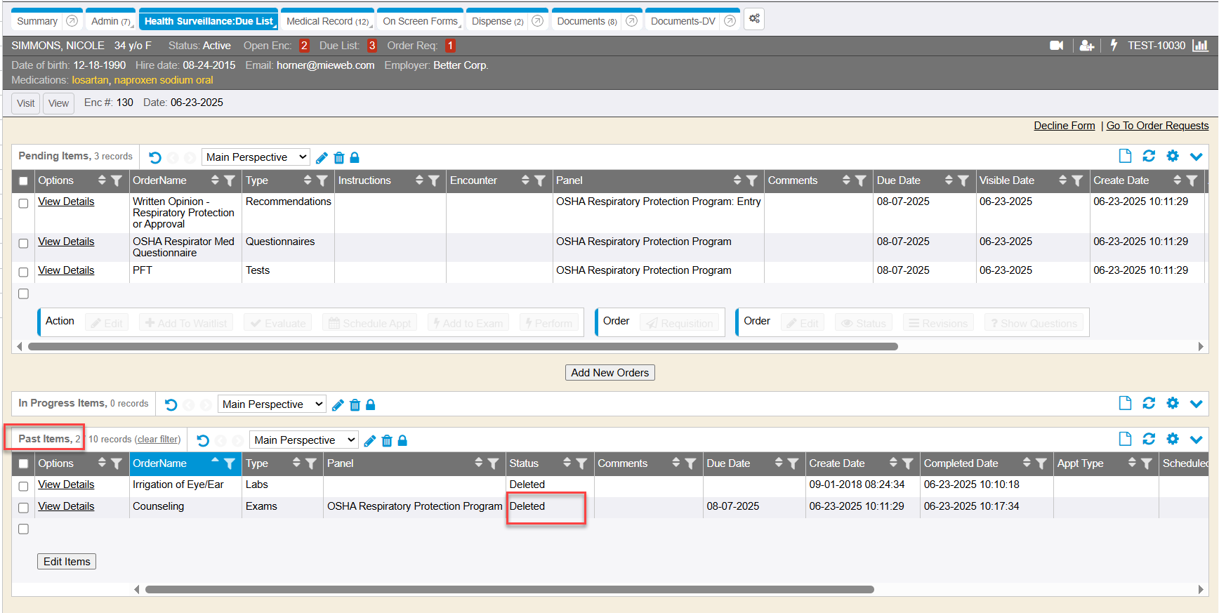 After the system saves your work, the expanded Tests & Procedures section will refresh and the items have been removed from the pending due list. It has marked it with today’s date as ‘deleted’ in the background.