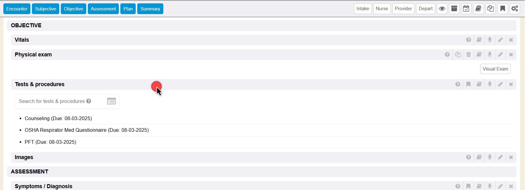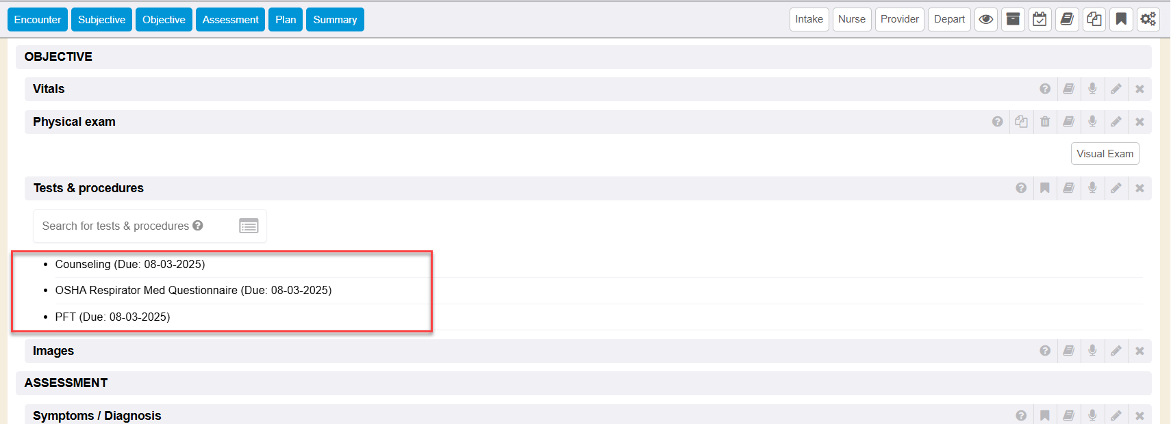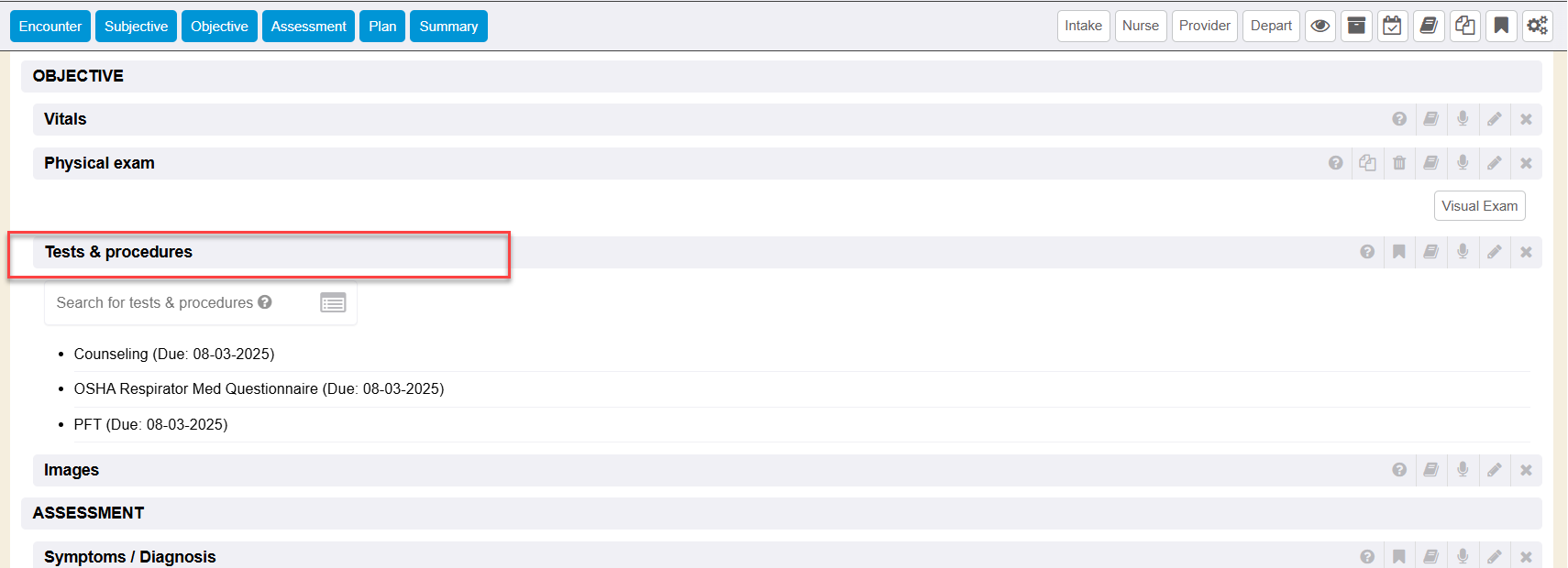 The Tests & Procedures encounter section can be found in the Objective section. This section mimics the stand alone “Due List” chart tab. The Tests & Procedures section displays items that are “due” so when a patient comes in, and the staff is working in an encounter, the clinician has visibility of items that the patient is due for, here in this encounter section. Note: These same items are also visible from the separate chart tab named Due List. For more information on the Due List stand alone chart tab, please see Due List guide.