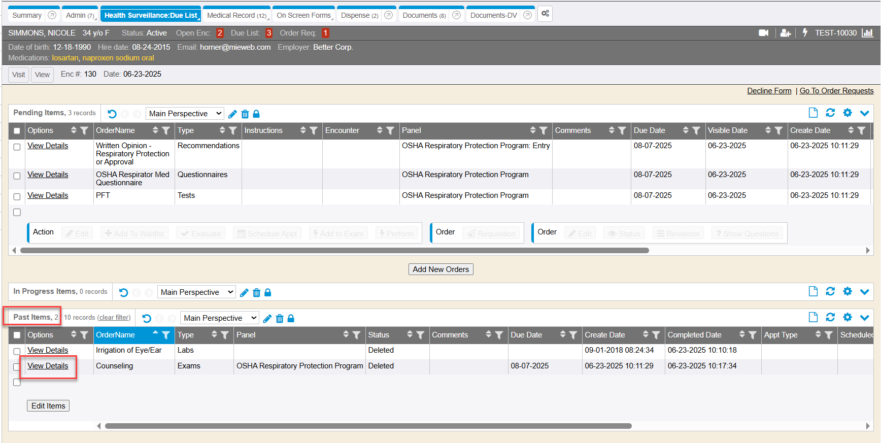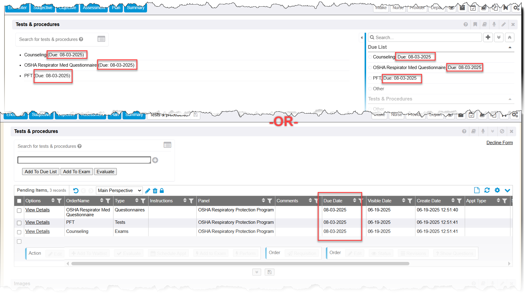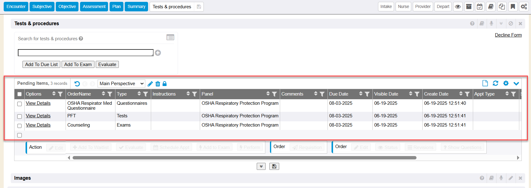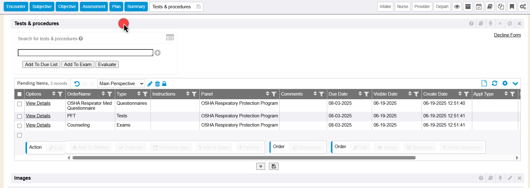Items/procedures/tests are pending due for the patient/employee. If the order item has a specific due date, the due date will also be visible. This will help you see what is due and if you want to go ahead and do those items on the patient today during the visit, or wait until a future visit closer to the due date. Note: any items (such as questionnaires being completed via the portal) are ‘in progress’ and therefore will not be shown in the tests & procedures encounter section. Written Opinions (RE order items) are also not shown in the tests & procedures encounter section. Written Opinions (RE order items) are shown in their own Recommendations encounter section.