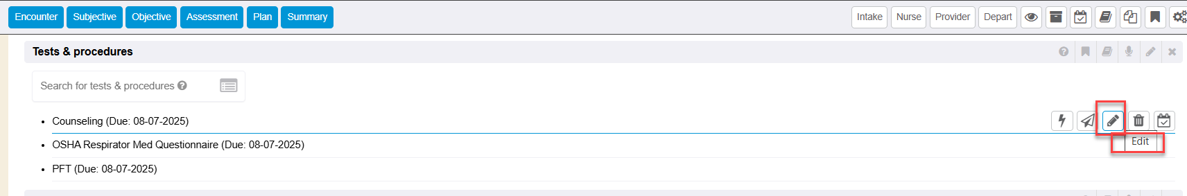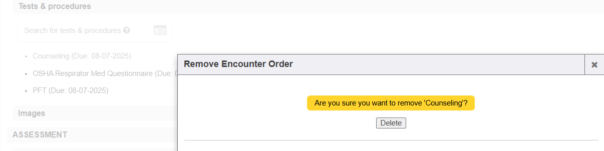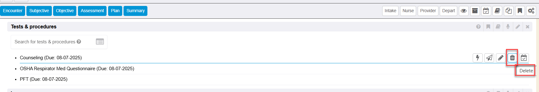 When you click the delete icon button for a specific selected procedure item(s) in the Tests & Procedures section, and the system saves your work, refreshes the encounter, opens you back up to the expanded Tests & Procedures section and that item(s) is removed from the pending due list. It has marked it with today’s date as ‘deleted’ in the background.