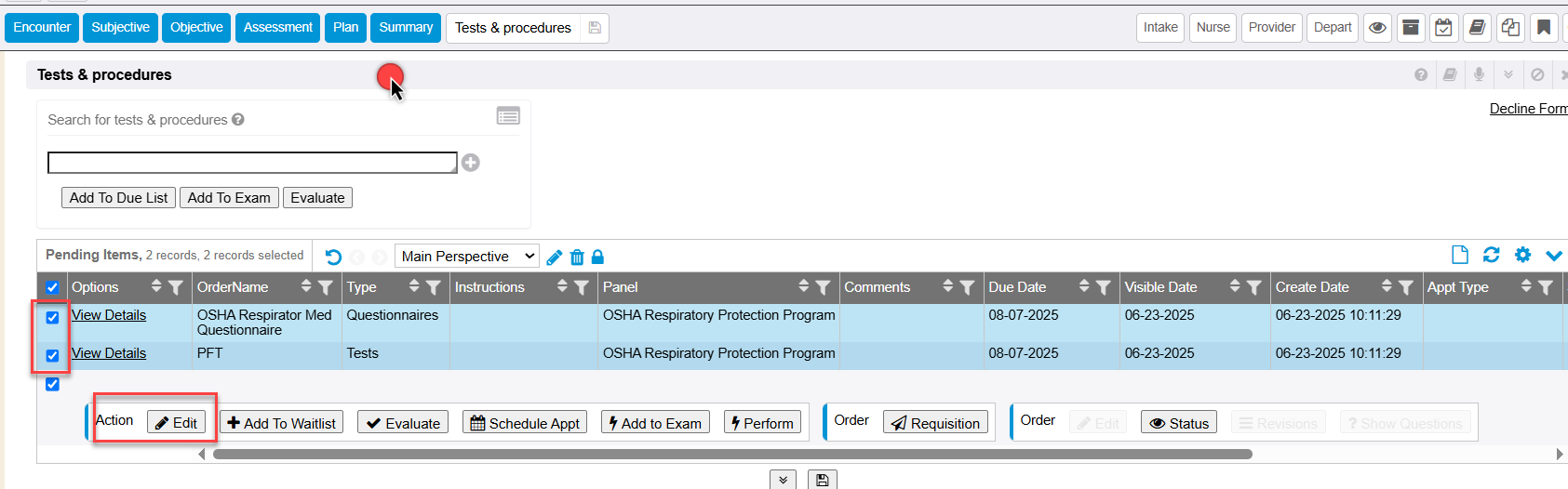 There is the ability to edit multiple procedure items from the pending due list when working in an encounter. Simply expand open the Tests & Procedures encounter section by clicking anywhere on the grey title section area.