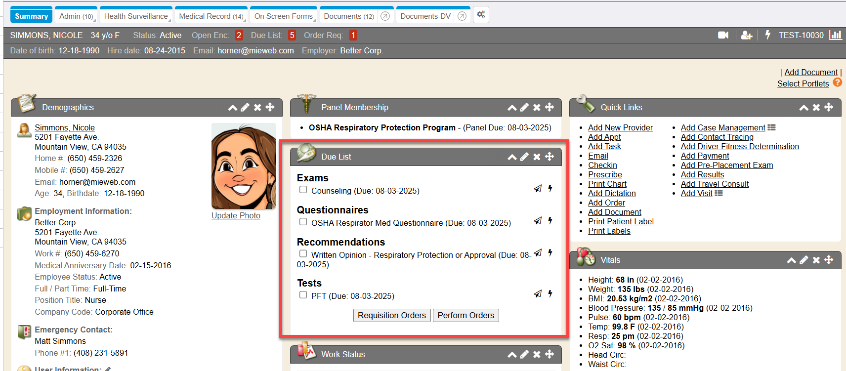 Within the Summary dashboard chart tab, there is a portlet available named** Due List.** This portlet displays any pending due list items for the chart. These are not “orders” that were referred out to have performed, but these are pending due list items (tests/procedures) that need to either be ordered and referred out to an outside facility, or items that need performed in office and marked as completed or worked (such as declined, waived, etc). This list is managed in the Due List chart tab and/or from the Tests & Procedures section within encounters.