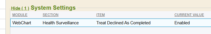 TIP: We recommend the system setting Treat Declined As Completed stay enabled in the system by default. As enabled, Health Surveillance will treat declined order items (when related to health surveillance panels) the same as normally completed ones for forecasting purposes. If this setting is disabled, declined order items (when related to health surveillance panels) will be treated the same as those not completed.