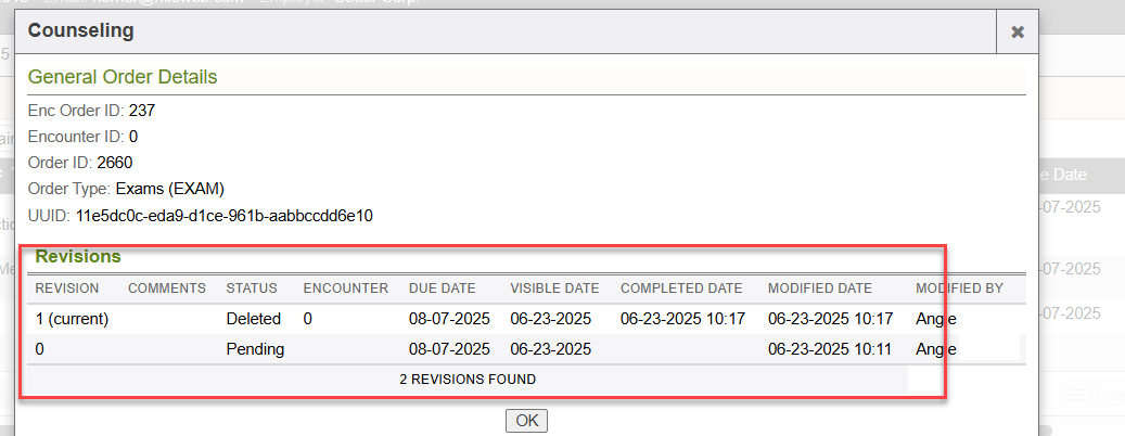 You have visibility to edited order items (and their respective current status) back in the stand alone Due List Chart Tab typically in the Past Items section and where View Details can be utilized to access details of the revision history to an order item that was on the chart’s due list.