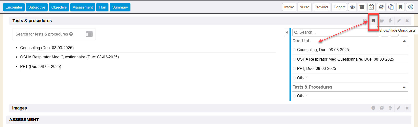 A banner or bookmark icon is located on the right side of the Tests & Procedures encounter section. This can be clicked to expand open to utilize the right side quick list functionality for the Tests & Procedures section.