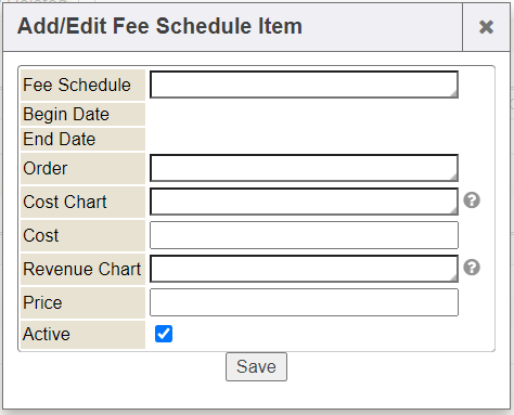 To make the fee item active in the fee schedule, enable the Active check box. To enter the item in the fee schedule but make it inactive (not available to be selected), disable the Active check box.
